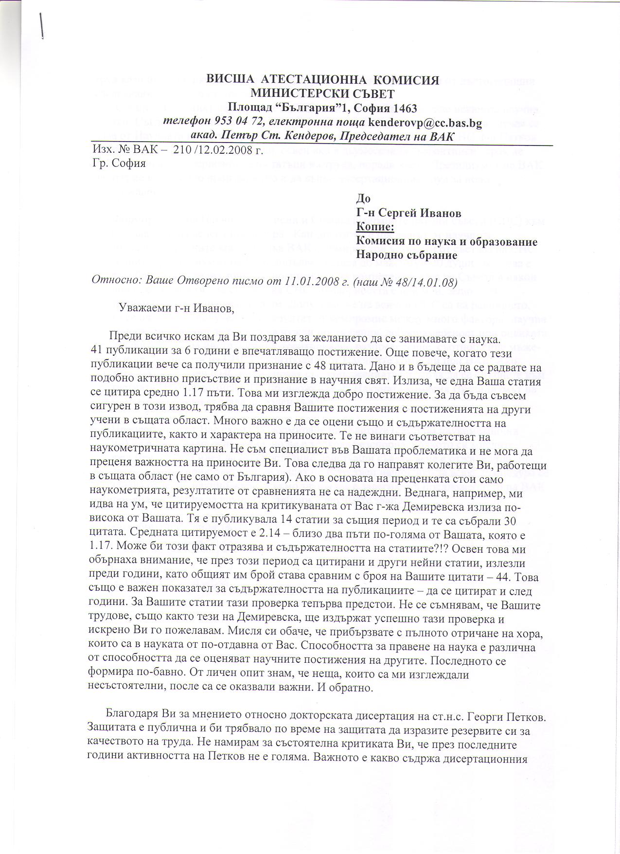 Акад. Петър Кендеров, Отговор на отвореното писмо на д-р Сергей Иванов, ВАК, изх. №210/12.02.2008 г., гр. София